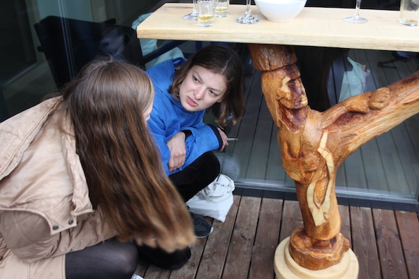 You came to me and said let's make a chair. Then you realized the chair could be cheers. And with cheers we have a glass, and we need a place to put the glass so we need a table. But it's perfect too, because chairs are often with tables. So here we are, Cheers and Tables. What a great misunderstanding! Cheers to Miss Understanding! Ah, but the Miss is standing under too. She's standing under the table. Cheers to the Miss standing under the table! But how can a Miss stand under a table, the table is too low for a Miss, unless the Miss is very tiny or it's a very big table, but this is just a normal table, it has legs, legs Like the Miss. But what if this is not a real Miss but a representation of the Miss? She could be made of stone, like a caryatid. A what? A caryatid; a column in the shape of a woman. Karate? Yes she's doing karate! Cheers to the miss standing under the table doing karate! But what now? What could it become? Is it an illustrative conversation? It is more than just an illustration. What is it for you, this cheers? It is at once a potential object and at the same time a story. And for you? A language tool for sculpting secrets.