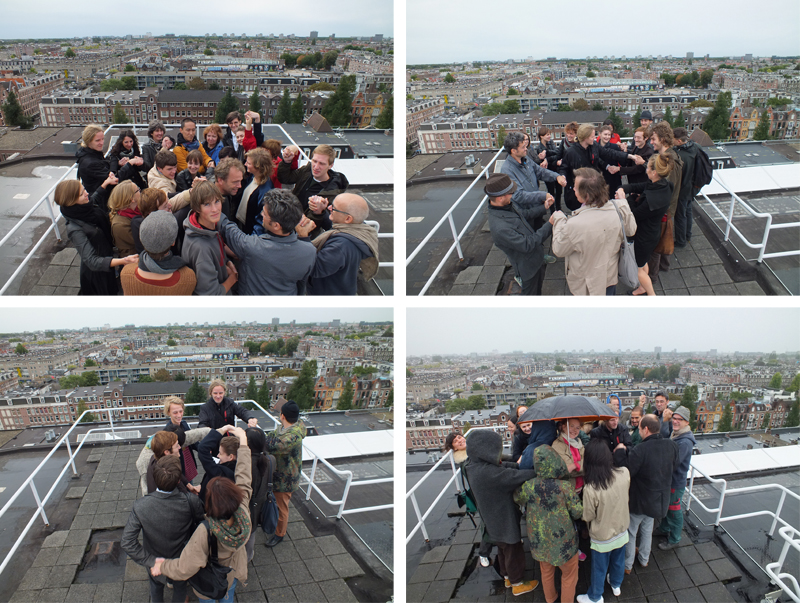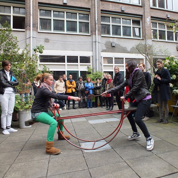 The 1st movement begins in the Marble Hall, where I tell a story of how I want to meet a man called "The Marble Man". The 2nd movement is to the inner courtyard where two people emerge from the audience to have an impromptu conversation about Cliche. Suddenly two girls emerge and sit on a seesaw. They go back and forth with philosophical questions and proclamations regarding equality and inequality. They remain linked through a double spatula object. In-between their voices, a man out of a window blasts a saxophone composition based on the shofar call and response in the Jewish new year ceremony. The final movement is to the roof, first in a small glass room where a poem about meetings is told, and last onto the very top for a collective handshake agreement, where a photo is taken.
