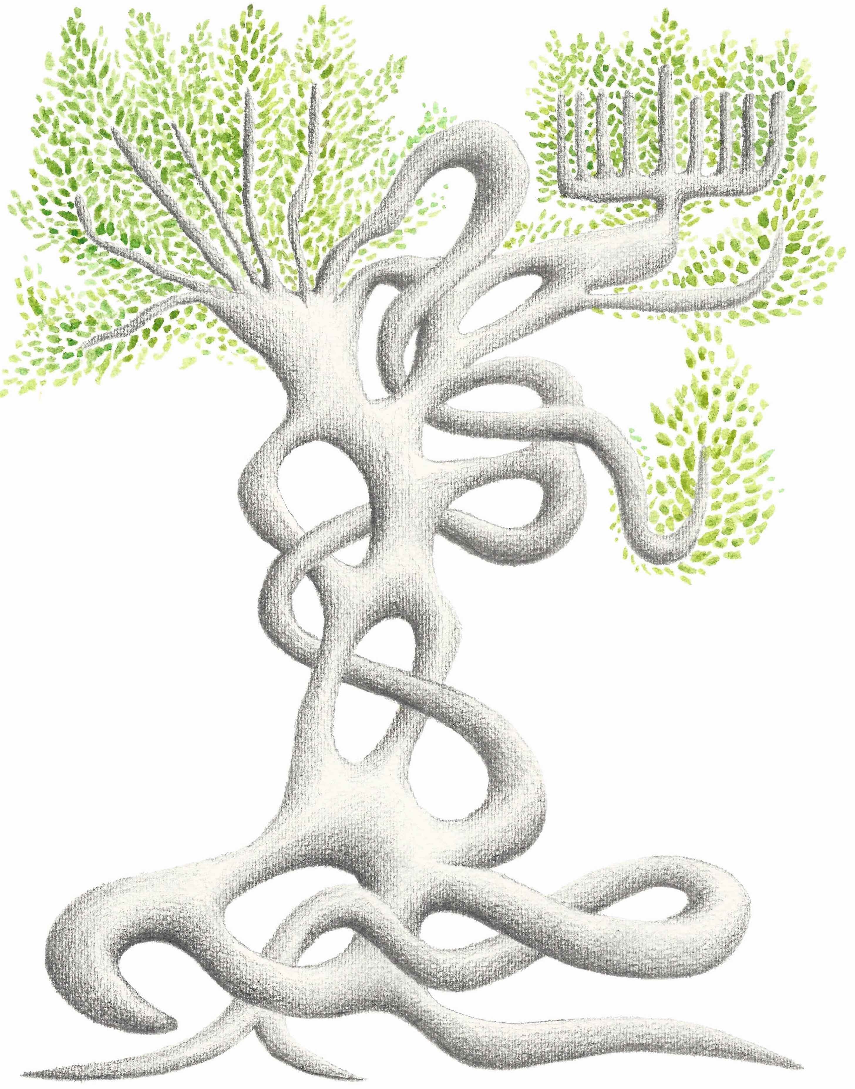 The drawing shows an intertwined olive tree with a menorah as one of the branches. The tree is interwoven to symbolize how our struggles for human rights, freedom, safety, and dignity are not something that we fight for alone, but we must be in solidarity with all people to achieve this. We are all interconnected in this world; people, animals, and plants. As Jews we must fight for equality and freedom for all people in Palestine, it is our moral duty. By replanting olive trees, we support this effort in a small but meaningful way to help Palestinian farmers to re-root in the land.