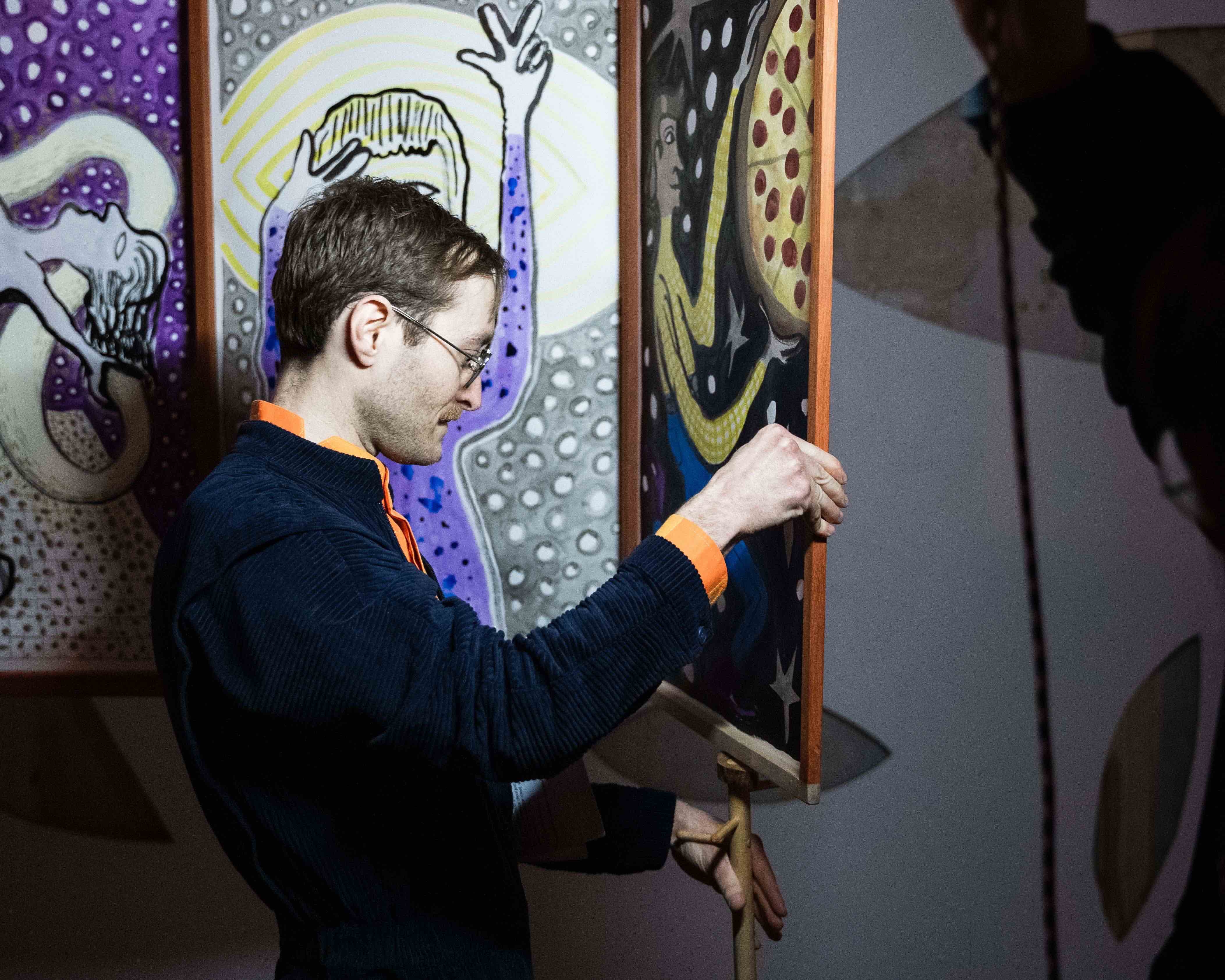 To Half Sell A Duck is an exhibition and performance that brings together a constellation of works around the theme of queer religious futures. David explores "Judeo-Futurism", reclaiming historical symbols of oppression by rethinking them and placing them into joyful and perverted fantasies. Guests will be guided through the exhibition with a performance that tells a story about a radical priest who makes kinky paintings, the creation of a Golem who fights canards, and an encounter with the artist Danh Võ who asks David to cut up a medieval wooden Jesus into pieces.